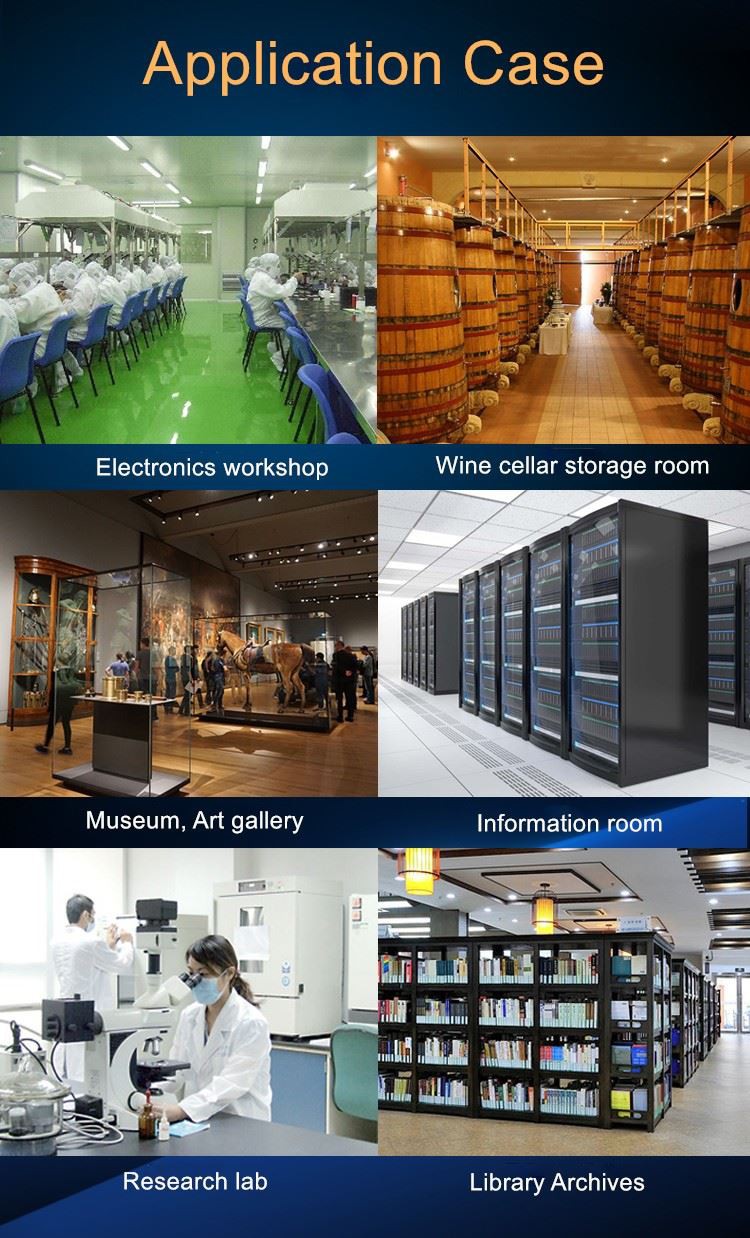 Область применения: Идеальное оборудование для кондиционирования воздуха для различных сред, таких как оборонная промышленность, фармацевтика, электроника, больницы, банковское дело, полиграфия, компьютерный зал, станции снабжения и распределения, торговые центры, гостиницы, лаборатории и другие склады точных компонентов.